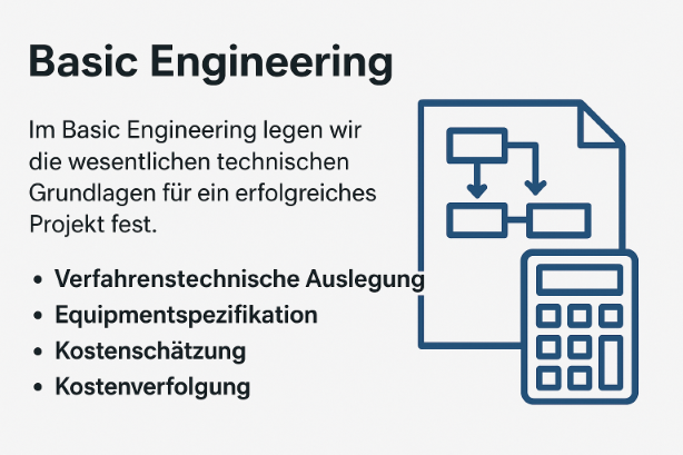 Im Basic Engineering legen wir die wesentlichen technischen Grundlagen für ein erfolgreiches Projekt fest. Dazu gehören die verfahrenstechnische Auslegung aller relevanten Prozesse sowie die Erstellung präziser Equipmentspezifikationen, die eine klare Definition der technischen Anforderungen sicherstellen. Ergänzend erarbeiten wir eine fundierte Kostenschätzung, die eine transparente wirtschaftliche Bewertung des Projekts ermöglicht und als verlässliche Entscheidungsbasis dient.